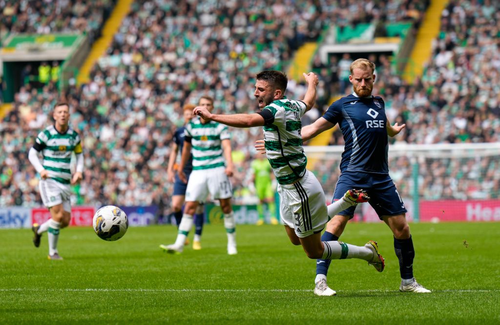 Greg Taylor of Celtic fouled inside the penalty area by Josh Sims of Ross County. Celtic v Ross County, cinch Scottish Premiership, Football, Celtic Park, Glasgow, UK – 05 Aug 2023. Photo Stuart Wallace/Shutterstock