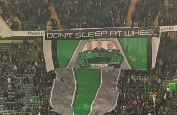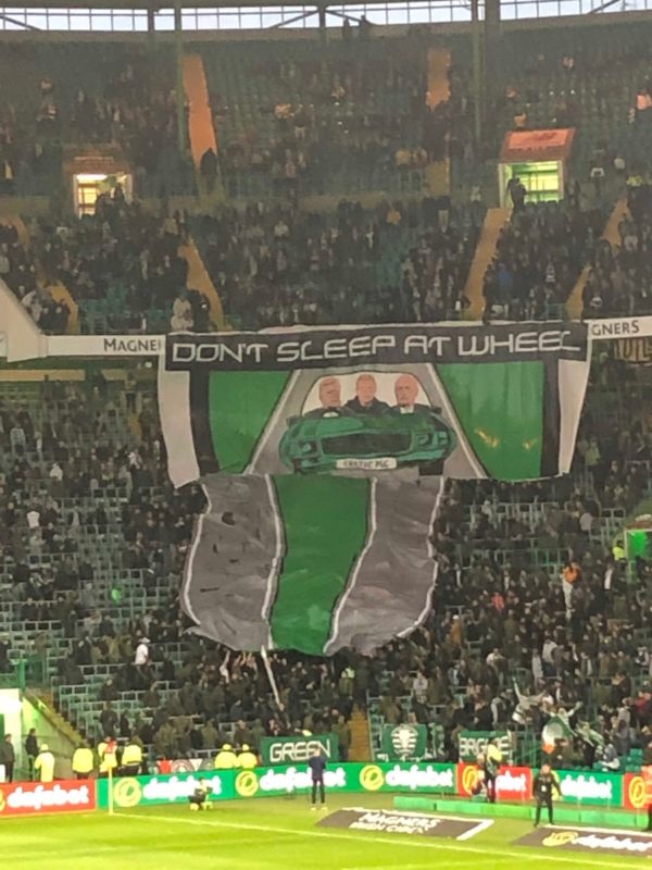 The Green Brigade had another significant message for the Celtic Board ahead of kick-off. Their graphic had Lawwell and Dermot Desmond in the front with Neil Lennon in the back seat of the car and the text said “Don’t sleep at wheel.”