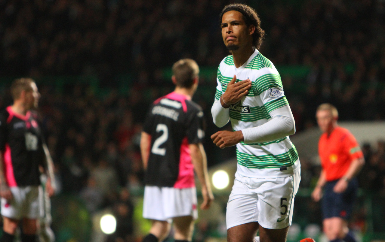 Virgil van Dijk celebrates scoring agains Patrick Thistle at Celtic Park on 3 December 2014. Photo Vagelis Georgariou
