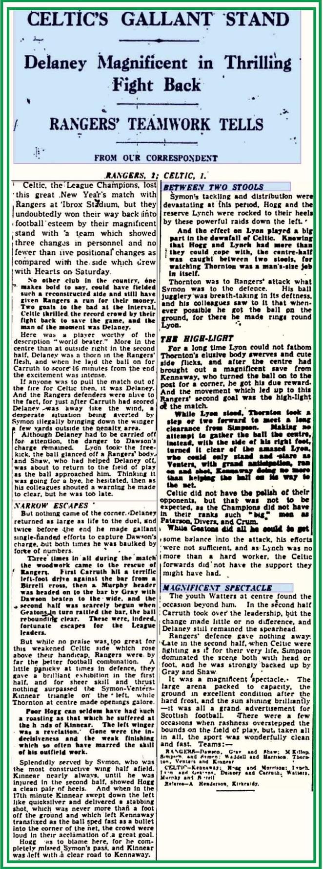 They saw Celts make a stunning start, with goals from Jimmy Delaney and Malcolm MacDonald in the first four minutes, before Fred Warren reduced the deficit by half-time. Then, with just seconds remaining, Archie Garrett made it 2-2, just as he had in the Parkhead League fixture at Hogmanay.
