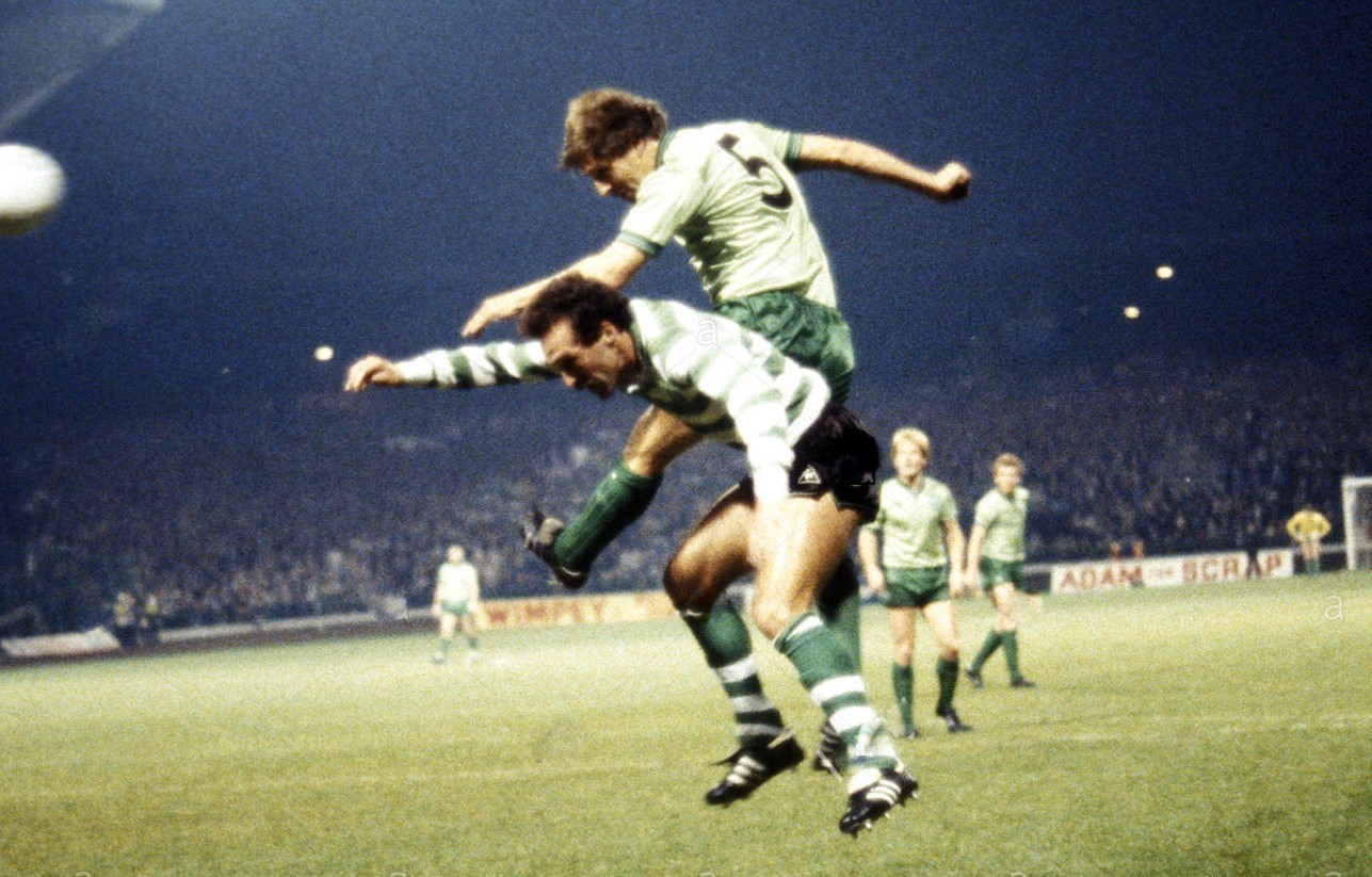 02/11/83 UEFA CUP 2nd ROUND 2nd LEG CELTIC V SPORTING LISBON (5-0) (5-2 agg) Celtic’s Tommy Burns (right) opens the scoring with a header past