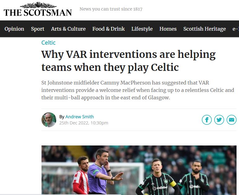 Compare this against stonewallers not given against rangers,for similar fouls that the VAR officials then deemed as a penalty in Celtic games? This you will find is the main cause of complaint. Consistency in applying the laws is the issue, and it seems to favour rangers.