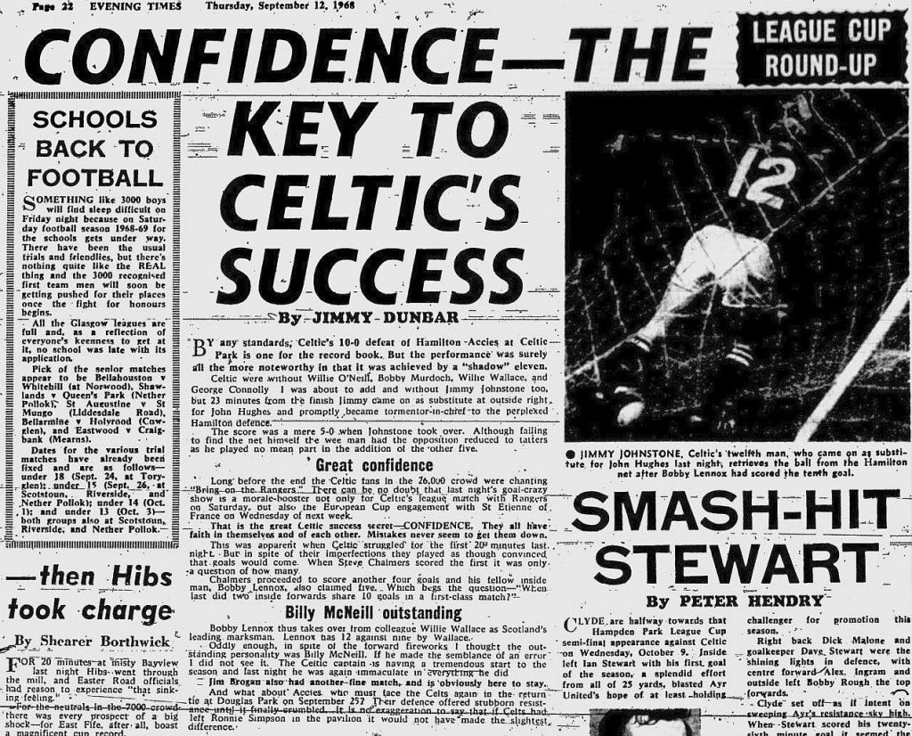 11th September 1968, Celtic beat Hamilton 10(TEN) nil.