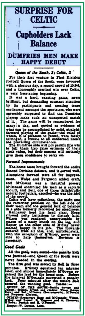 A poor season begins the way it will continue as Celtic open the League campaign with a 2-3 defeat at Palmerston Park to Queen of the South. Jimmy McGrory and William “Peter” McGonagle (with a penalty kick) score Celtic’s goals but it is a poor show