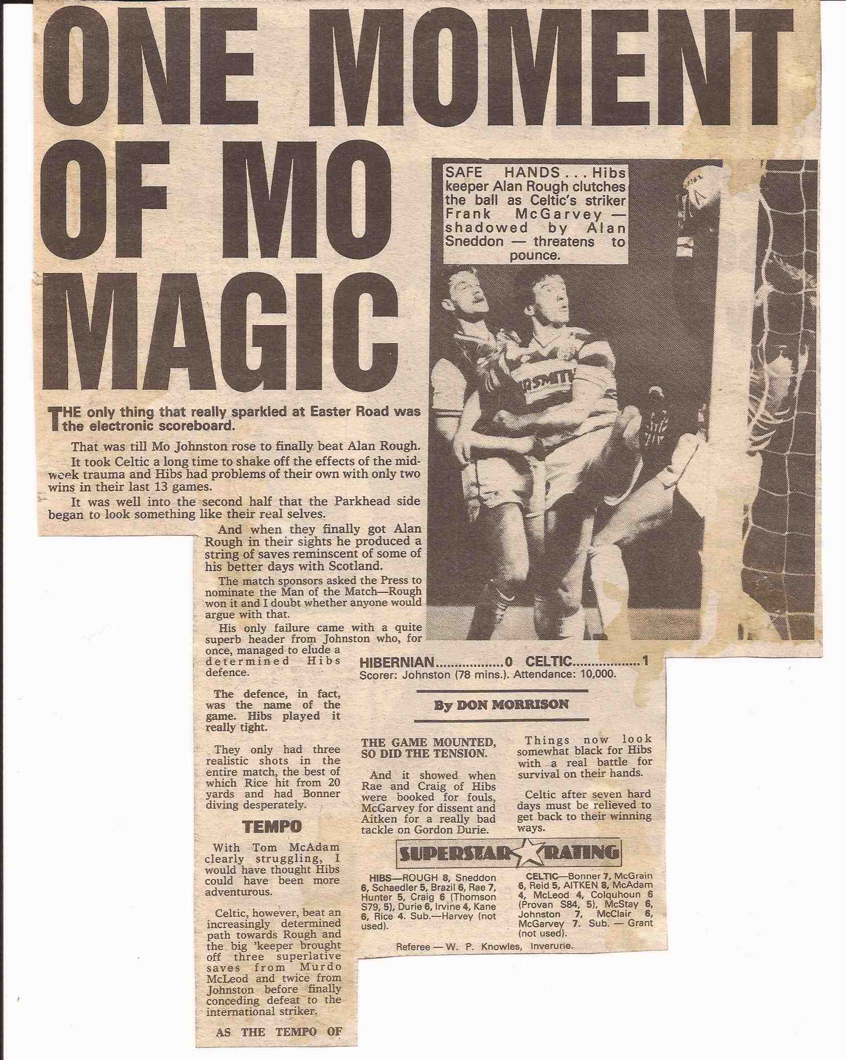 SATURDAY 15 DECEMBER 1984 – Celtic are now in a bad way. Following their defeat at Pittodrie last week, then their trip to Old Trafford to lose to Rapid Vienna who can only be described as “cheats”, they travel to Easter Road today where in a dire game of football, they scrape a 1-0 victory with a goal scored by Mo Johnston. But the team and the supporters are hurting.