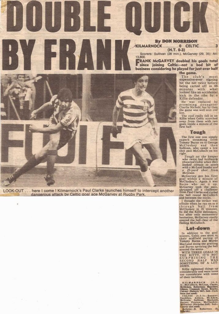 13,800 are at Rugby Park, Kilmarnock to see a good Celtic performance as they beat Kilmarnock 3-0 with two goals from Frank McGarvey and one from Dom Sullivan. In the second half a long-haired youngster called Charlie Nicholas appears and impresses the crowd who have heard so much about him. Young Irish goalkeeper Paddy Bonner, playing in one of his early games for the club, also does well.