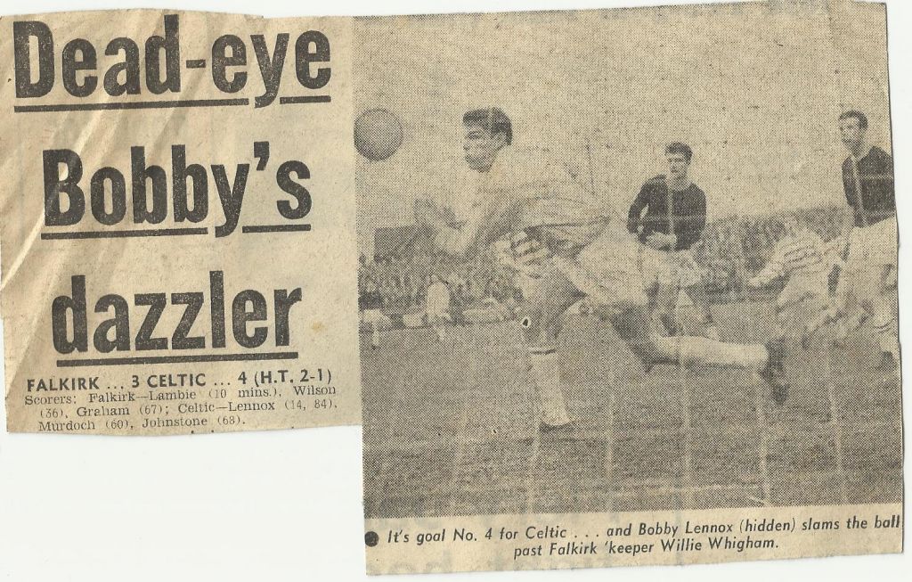 Brockville has seen rather too any Celtic disasters in the past, but today sees a great game which Celtic win by the odd goal in seven. Celtic were three times behind but equalised on all three occasions before Bobby Lennox scored the winner. It was Lennox’s second goal, and the other two goals were scored by Bobby Murdoch and Jimmy Johnstone.