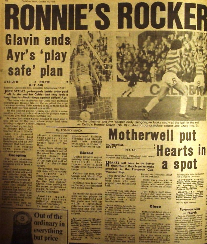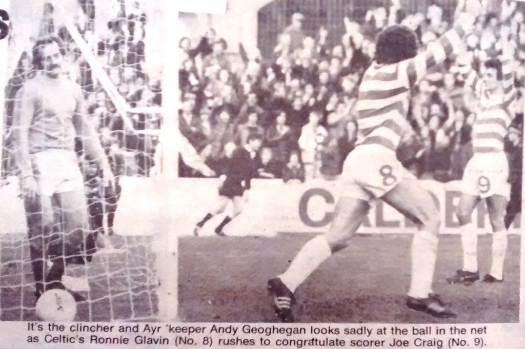 12,871 travel to Somerset Park, Ayr, to see Celtic register a 2-0 victory with goals from Ronnie Glavin and a late counter from recent signing Joe Craig. Pat Stanton has a brilliant game in the defence.