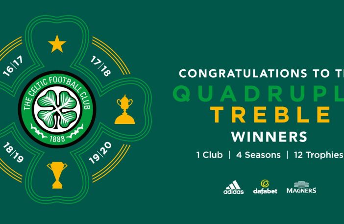 SUNDAY 20 DECEMBER 2020 – It is the most bizarre Scottish Cup final of them all. Covid restrictions have compelled it to be played in front of an empty stadium on the eve of Midwinter’s Day. It is unreal, but Celtic win the Scottish Cup for the 40th time in a penalty shoot out against Hearts who deserve a lot of credit for their comeback after Celtic were 2 up at half time with a goal from Ryan Christie and a penalty from Odsonne Edouard. Then in extra time after Leigh Griffiths scores, Hearts come back again. The Celtic hero was the little known goalkeeper Connor Hazard who saves two penalties in the shoot out before Kristofer Ajer scores the crucial one. Thus in more or less unbelievable circumstances, Celtic win their 40th Scottish Cup and their Quadruple Treble.