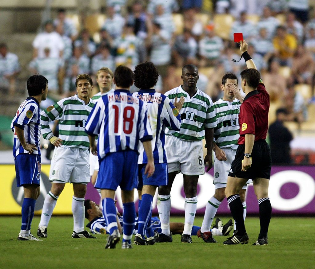 SEVILLE – MAY 21: Dianbobo Balde of Celtic is sent off by referee Lubos Michel during the UEFA Cup Final match between Celtic and FC Porto held on May 21, 2003 at the Estadio Olimpico in Seville, Spain. FC Porto won the match and trophy 3-2 after extra-time. (Photo by Michael Steele/Getty Images)