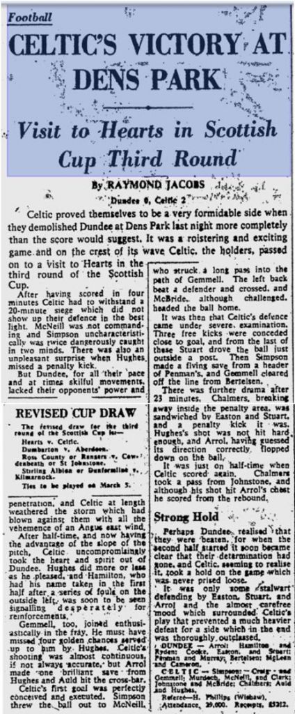 WEDNESDAY 23 FEBRUARY 1966 – Saturday’s Scottish Cup game at Dens Park was postponed because of snow, but is played tonight in front of a large crowd of 29,000, quite a few of them with piece bags and flasks, having come straight from their work! They are rewarded by a good game. Dundee, a good side, fight well but Steve Chalmers and Joe McBride score the goals to see Celtic into the next round.