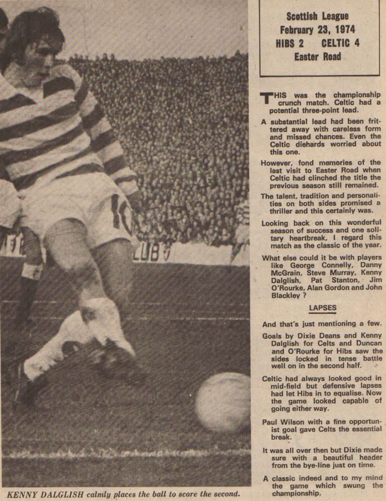 SATURDAY 23 FEBRUARY 1974 – 48,554 enjoy a fine game of football at Easter Road, a ground on which Celtic have often turned on their best football against a team who are similarly inclined to entertaining the public. Celtic win 4-2 with Dixie Deans scoring in the first and the last minutes of the game and Kenny Dalglish and Paul Wilson scoring the others while Arthur Duncan and Jim O’Rourke score for Hibs. The General Election is to be held in the following Thursday and the various parties are canvassing for votes in Leith Walk with one lone Conservative with a blue rosette compelling reluctant admiration for his bravery.