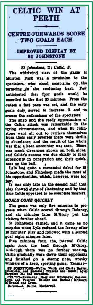 The death is announced of Tom Maley, a member of Celtic’s first ever team and of course the brother of manager Willie Maley. Celtic’s game against St Johnstone at Muirton Park goes ahead but Celtic wear black arm bands. Willie Maley does not travel but appears at Buchanan Street Station to see the team off and to tell them to “pull out something special for Tom today”. They do just that, winning 3-2 with two goals from Jimmy McGrory and one from Jimmy Delaney.