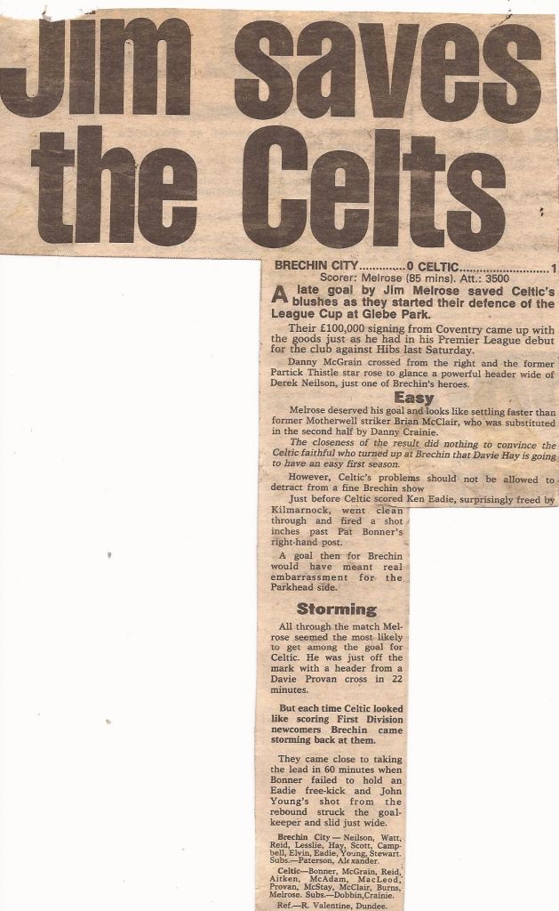 It is a long time since Celtic visited Glebe Park, Brechin but they do so tonight in the Scottish League Cup, beating the spirited local side 1-0 thanks to a goal from Jim Melrose. New Manager Davie Hay is so far doing well enough, but the loss of Billy McNeill as well as Charlie Nicholas has not gone down well with the unhappy supporters.