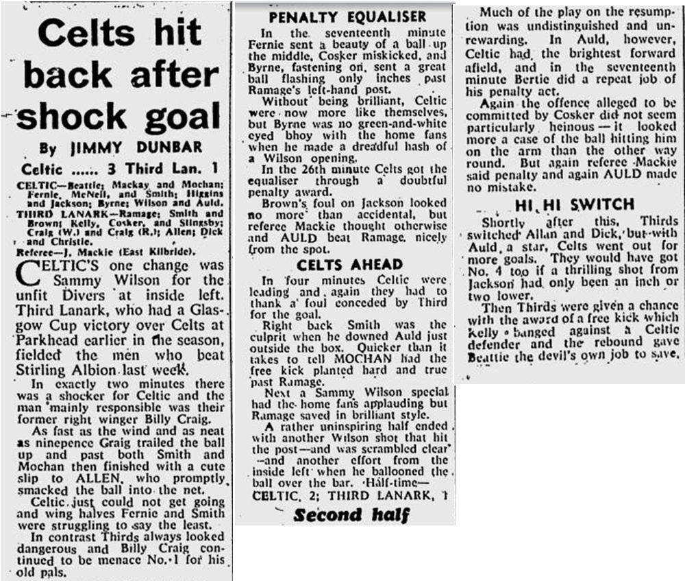 Bertie Auld scores two penalties as Celtic beat Third Lanark 3-1 at Celtic Park after Third Lanark had scored first. Neil Mochan scores the other goal. 18,000 attend but the big game of the day is at Hampden Park where Hearts win the Scottish League Cup by beating Partick Thistle 5-1.