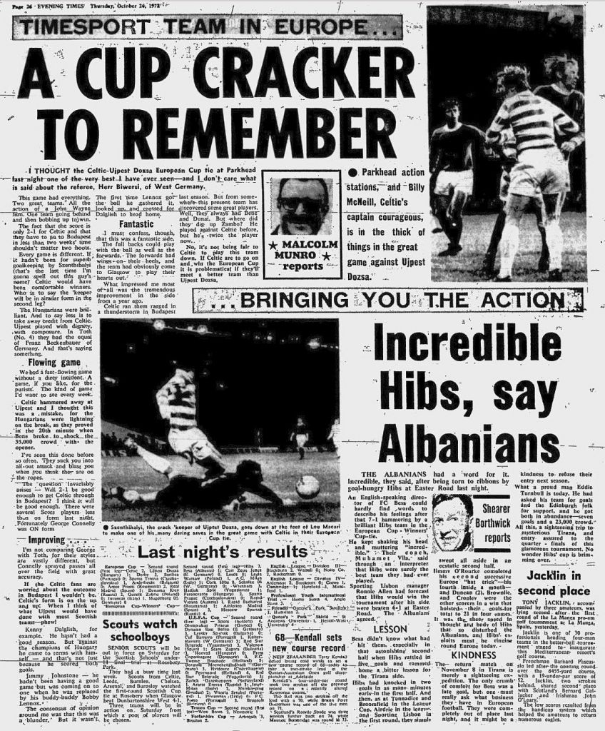 Kenny Dalglish scores twice as Celtic win the First Leg of their European Cup tie at Celtic Park against Ujpest Dozsa 2-1 before a crowd of 51,000. The problem was the goal scored by Bene for the Hungarians. It was generally agreed to have been a great game of football, but Celtic’s lead is a slender one.
