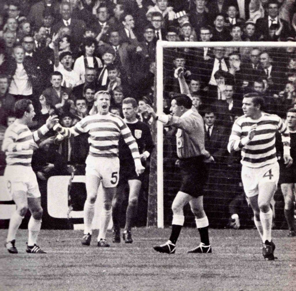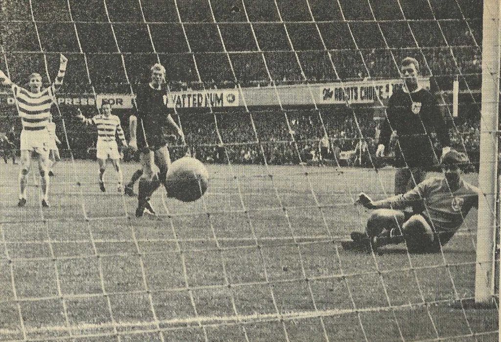 It is a tight game at Tannadice before 28,000 on a hot day, but Celtic, through Bobby Lennox, just edge through to maintain their unbeaten record. The team is the Lisbon team apart from Charlie Gallagher for Steve Chalmers.