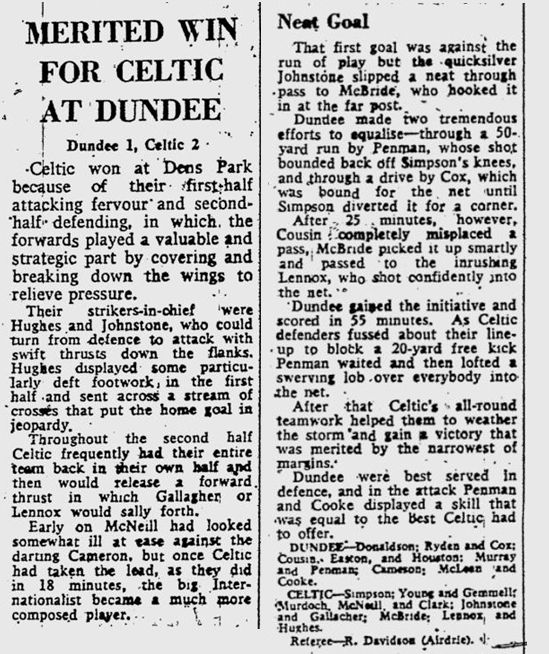 Celtic, on a high after their League Cup triumph on Saturday travel to Dens Park, Dundee to beat the home side 2-1. Goals are scored by Bobby Lennox and Joe McBride and when Dundee pull a goal back late in the game, the defence holds out to register an important victory. In 1965, Dens Park was one of the more difficult grounds to earn a win at.