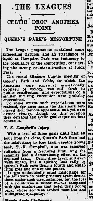 A rather remarkable League game ends up 4-4 between Queen’s Park and Celtic at Hampden today with two goals each from Jimmy McGrory and Joe Riley. It was generally agreed that John Thomson was the busier keeper but all the goals came in a flurry at the end and the game was enjoyed by 20,000 spectators. Meanwhile at Ibrox, Scotland beat Wales 4-2.