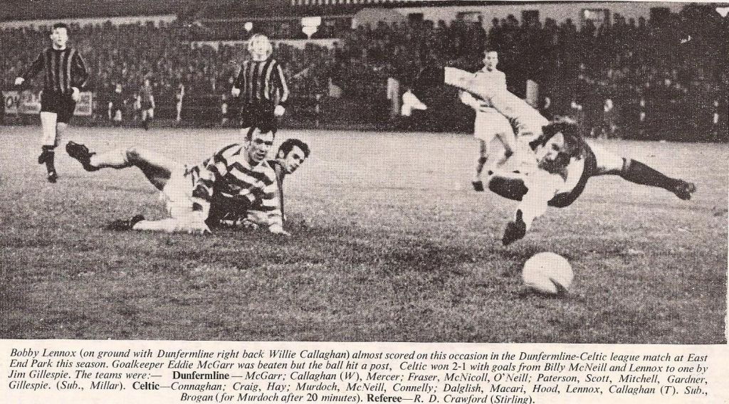 Following Saturday’s disastrous League Cup final against Partick Thistle, Celtic bounce back with a 2-1 win at East End Park, Dunfermline. 0-1 down at half-time and the Pars well on top, things do not look good until Billy McNeil scores on the hour mark, and then Bobby Lennox hits the winner near the end.
