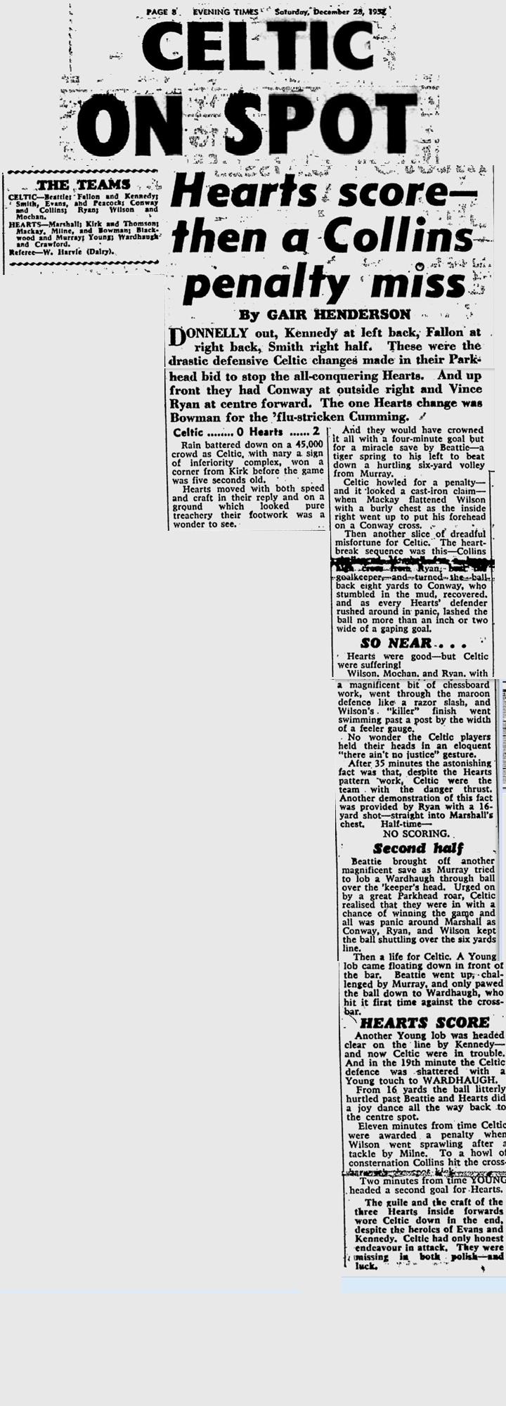 SATURDAY 28 DECEMBER 1957 – Celtic’s poor run continues with a 0-2 defeat by Hearts at Parkhead today. It is hard to believe that this was the team that won the League Cup in that epic 7-1 game only a couple of months ago, but there have been many changes in personnel since then mainly due to injury. On the other hand this is the Hearts team which will win the Scottish League for the first time since 1897, and they do look good. Jimmy Wardhaugh and Alec Young score the goals for them.