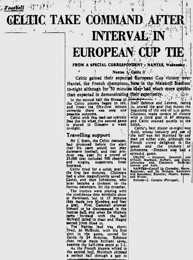 The soon to be Lisbon Lions had already bagged two trophies – the Glasgow Cup and the League Cup – and it was only late November Easing their way past FC Zurich in round one of the European Cup, Celtic had been firm favourites for the Nantes clash.