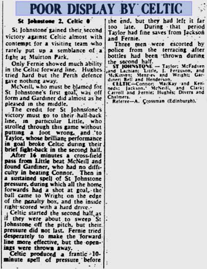 A shameful night for Celtic at Perth. The performance of the team at Muirton Park when they lost 0-2 and were all but eliminated from the League Cup is bad enough, but the behaviour of the fans is absolutely shocking with fighting, bottle-throwing, window breaking and other acts of vandalism committed near the ground and at the railway station. Such behaviour is rightly condemned by the club, but they fail to see a connection between hooliganism and mediocre performances by the team on the field.