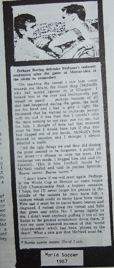SATURDAY 4th NOVEMBER 1967 – It is a terrible night for Celtic in Uruguay as they are defeated 0-1 by Racing Club, Argentina in the World Club Championship. The defeat is bad enough, but the collapse of discipline is even worse with John Hughes, Jimmy Johnstone and the mild-mannered Bobby Lennox sent off. In addition, Bertie Auld is sent off but does not go! Not all the blame is attached to Celtic, however, for the Argentinians are as bad, and the refereeing is woefully weak. Celtic and their reputation will take a long time to recover.