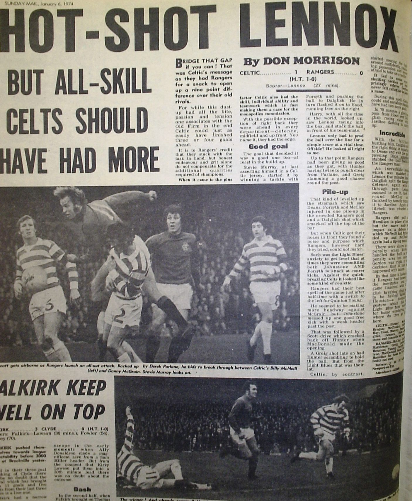 SATURDAY 5 JANUARY 1974 – Celtic’s 1-0 victory over Rangers at Parkhead should have been a lot more, such is Celtic’s superiority in class. Bobby Lennox scores the only goal of the game, but both he and Dixie Deans miss chances near the end.