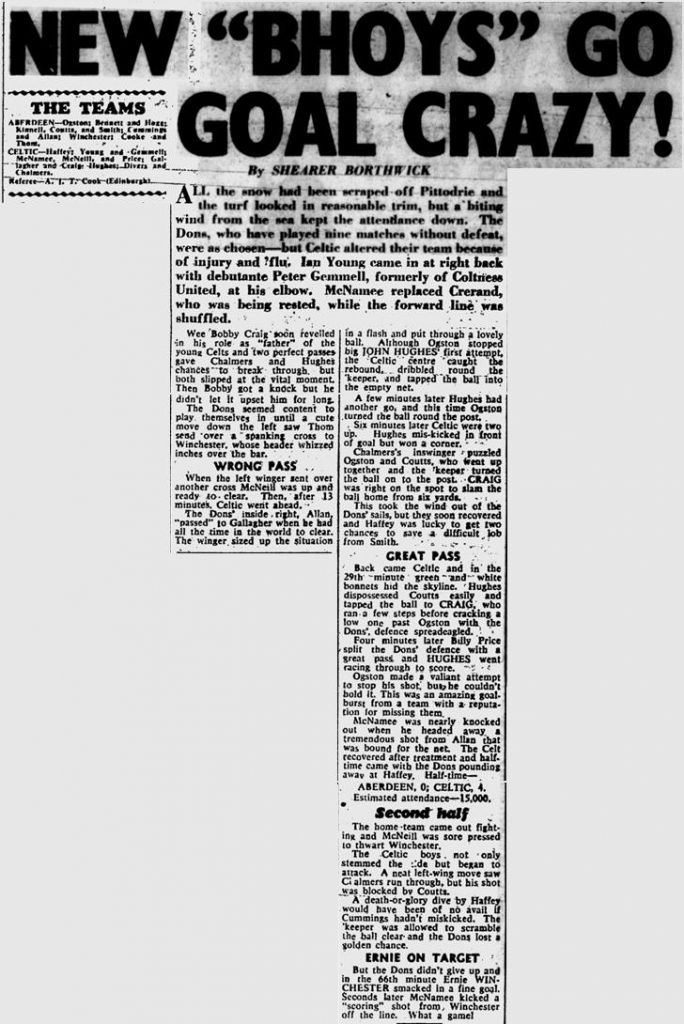 SATURDAY 5 JANUARY 1963 – Following New Year’s Day’s crashing 0-4 defeat at Ibrox, wholesale changes are made and the bullet is bitten in the dropping of Pat Crerand, the man held to be largely responsible for the defeat. In addition full back Dunky Mackay and Jim Kennedy are dropped, in come youngsters Ian Young and Tommy Gemmell, and Billy McNeill is made captain. These changes work a treat, and Celtic travel to Aberdeen to win 5-1 at Pittodrie with a hat-trick from John Hughes and two goals from Bobby Craig. The Celtic fans, small in numbers but extremely vocal in the 16,000 crowd and as always on good terms with the Aberdeen fans, roar their support for the team.