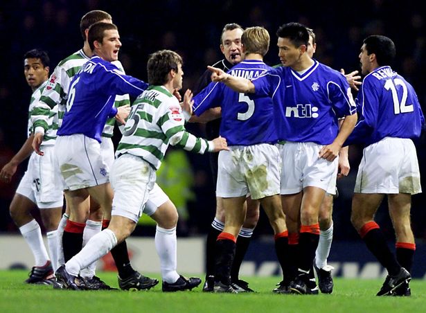 WEDNESDAY 7 FEBRUARY 2001 – In a match characterised by eccentric refereeing from Willie Young, Celtic beat Rangers 3-1 in the Scottish League Cup semi-final at Hampden. Two dubious penalties are awarded, one to each side, duly converted by Jorge Albertz and Henrik Larsson respectively and three players Claudio Reyna and Michael Mols of Rangers and Lubomir Moravcik of Celtic are sent off. Chris Sutton and Henrik Larsson had given Celtic two goals of a start before the silliness really started.