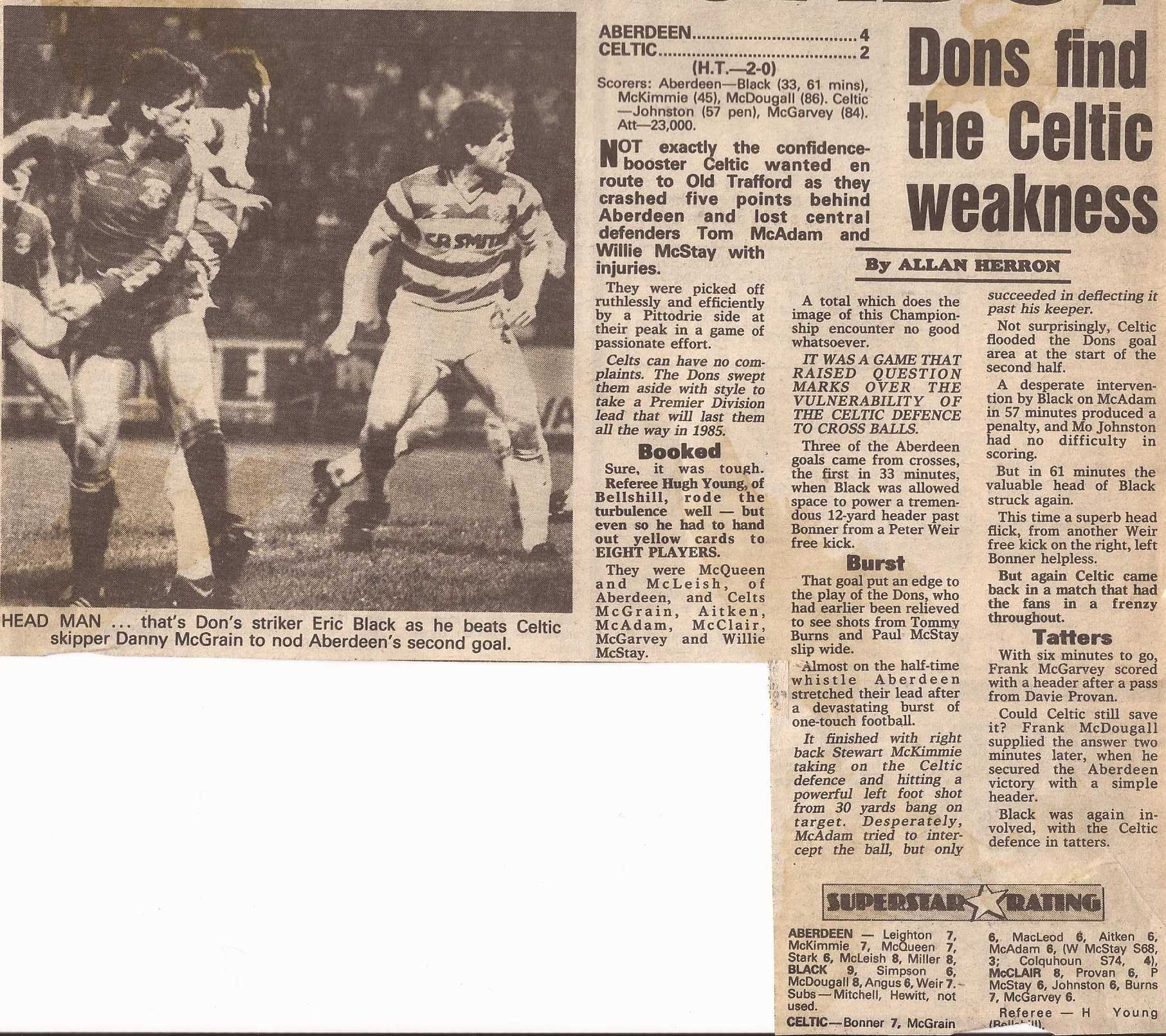 SATURDAY 8 DECEMBER 1984 – A large Celtic crowd at Pittodrie are extremely disappointed by today’s performance as Celtic go down to Alec Ferguson’s Aberdeen. Mo Johnston with a penalty and Frank McGarvey score Celtic’s goals and they are always in the game, but clearly second best to an Aberdeen side who win 4-2.