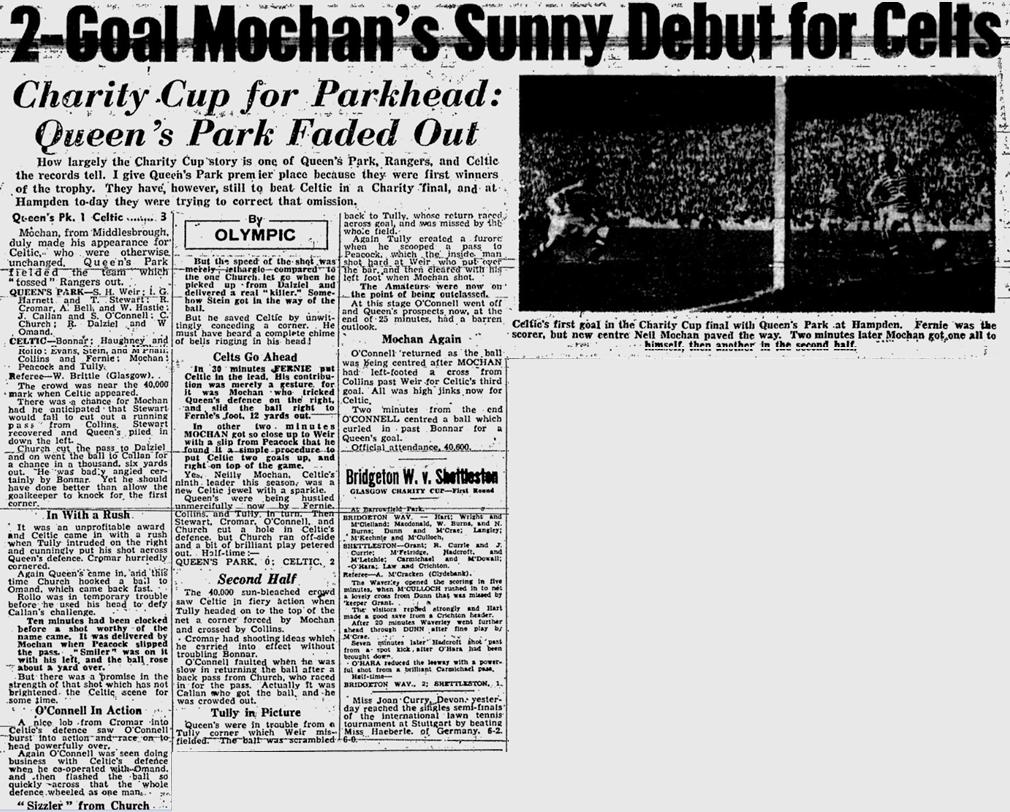 SATURDAY 9th MAY 1953 – Celtic seem to have unearthed a great player in Neil Mochan. Today he scores twice as Celtic win the Glasgow Charity Cup at Hampden in a 3-1 victory over Queen’s Park. Willie Fernie scores the other goal, and with the Coronation Cup about to start, hopes are high that Celtic can do well.