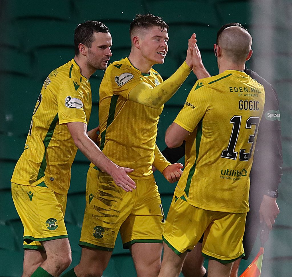 Kevin Nisbet of Hibernian celebrates after scoring a late equalising goal during the Ladbrokes Scottish Premiership match between Celtic and Hibernian at Celtic Park on January 11, 2021. (Photo by Ian MacNicol/Getty Images)