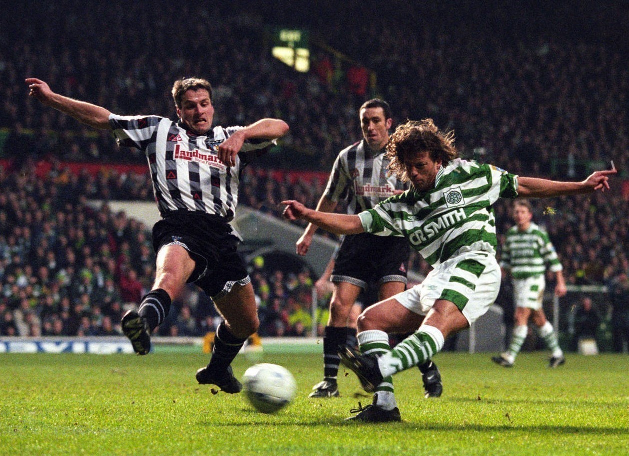 Pierre Van Hooijdonk scores for Celtic in the 4-2 win over Dunfermline in the Premier League on 28 December 1996. Photo The Celtic Wiki