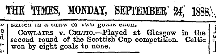 22 September 1888, Celtic defeated Cowlairs 8-0 in the Scottish Cup second round. In front of 7000 supporters, Celtic took their revenge as Cowlairs had beaten the Hoops in the first ever Glasgow Exhibition Cup final.