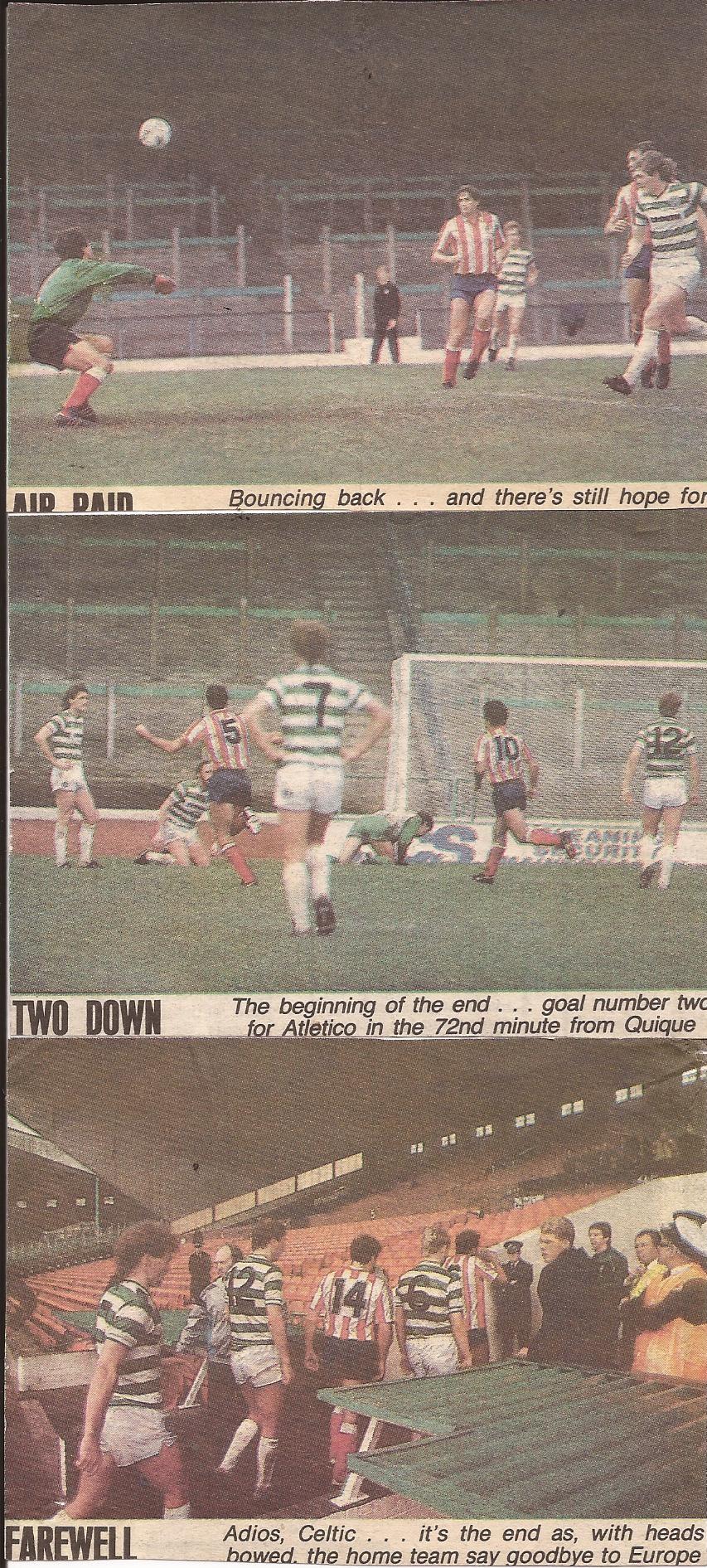 2 October 1985, Celtic are beaten by Atletico Madrid 2-1 at an empty Celtic Park. The game was played behind closed doors as a punishment by UEFA following supporter misbehaviour at Old Trafford against Rapid Vienna. Playing in front of no crowd hurt the pockets of the club by about £250,000. Coupled with limited TV and radio access as well as kick off starting at 2:00pm, majority of supporters were at their work and missed the game. Murdo MacLeod had a Van Vossen esque miss early in the match which really set the tone for Celtic’s entire afternoon. Roy Aitken pulled one back at 0-2 but it was all too late. Atletico ended up reaching the final of the competition in 1986 only to be beaten by Dynamo Kiev in France.