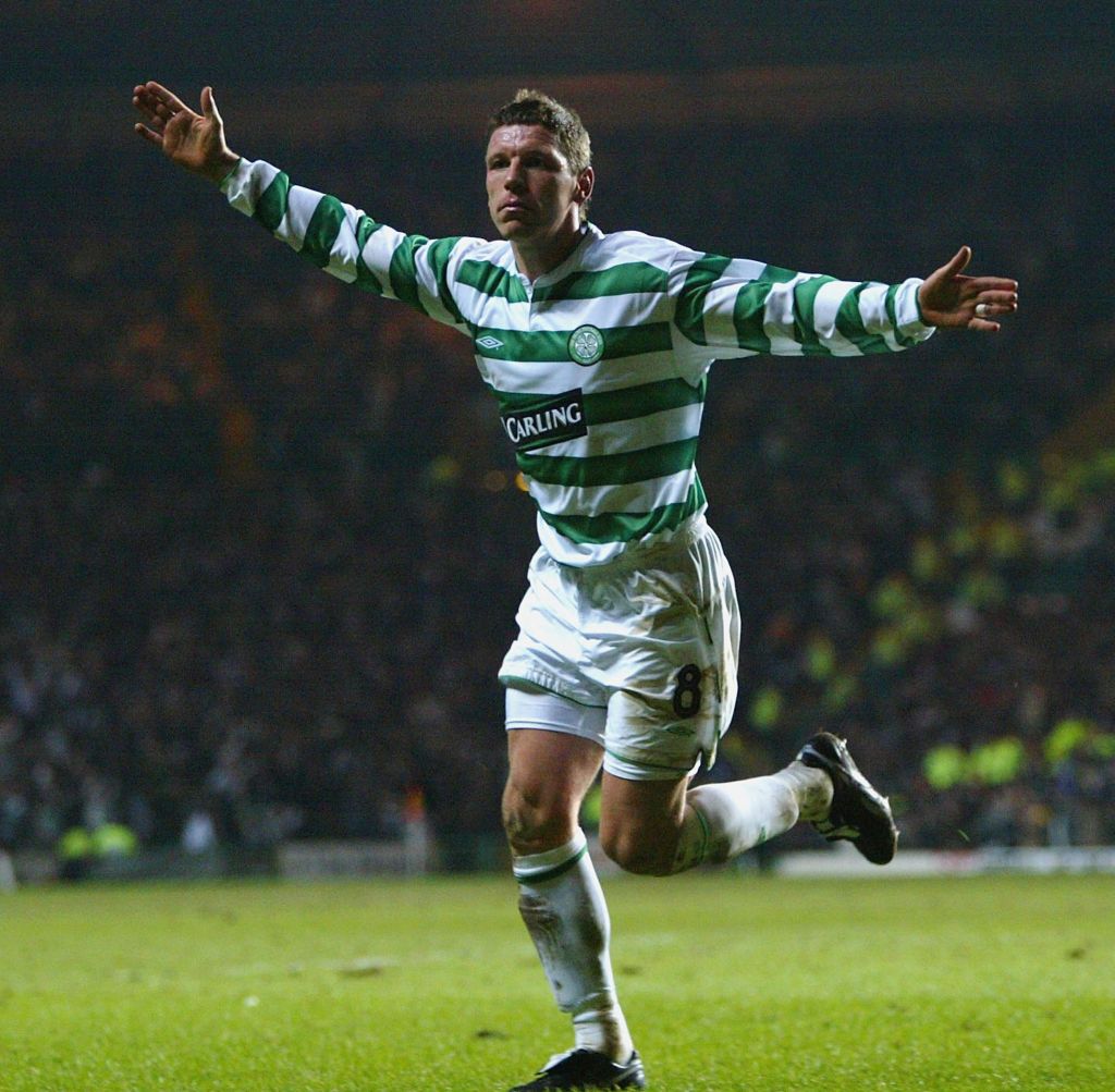 Alan Thompson of Celtic celebrates after scoring the first goal during the UEFA Cup Fourth Round, First Leg match between Celtic and Barcelona at Celtic Park on March 11, 2004 (Photo by Michael Steele/Getty Images)