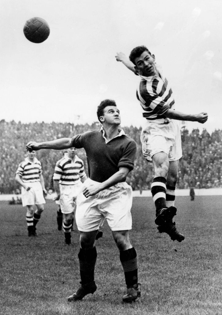 Grierson of Rangers left and Bertie Peacock of Celtic, jump to head the ball during the match at Ibrox Park, which ended in a 1-1 draw. A riot broke out at half-time and thousands of spectators invaded the pitch. Ambulance men treated casualties and the police made nine arrests. 21st September 1953 Photo TopFoto via Imago