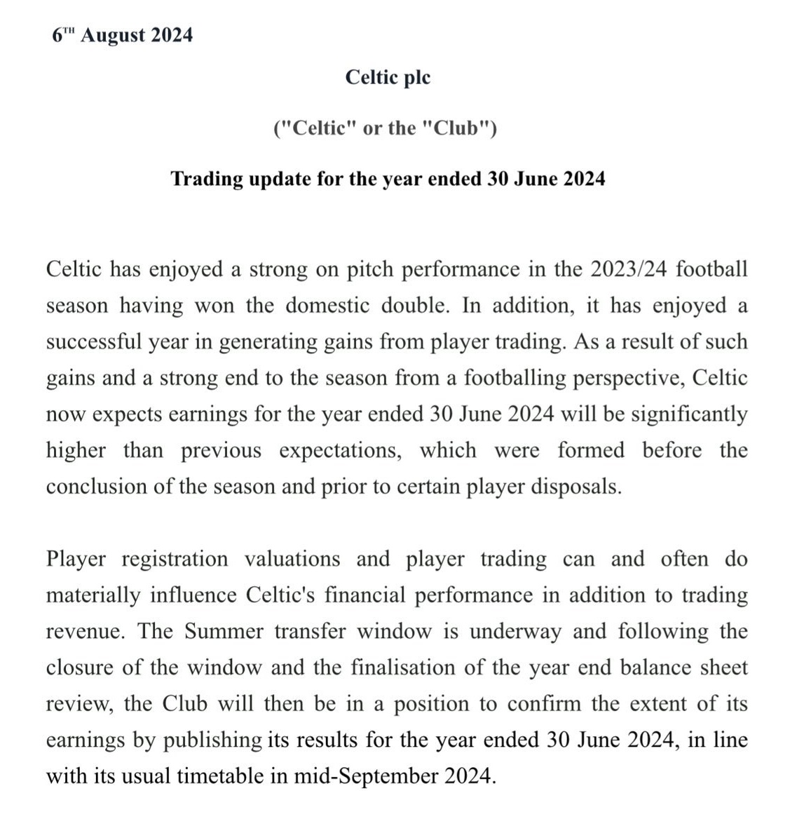 Celtic released this statement to the London Stock Exchange that the seasons earnings will be significantly higher than expected.