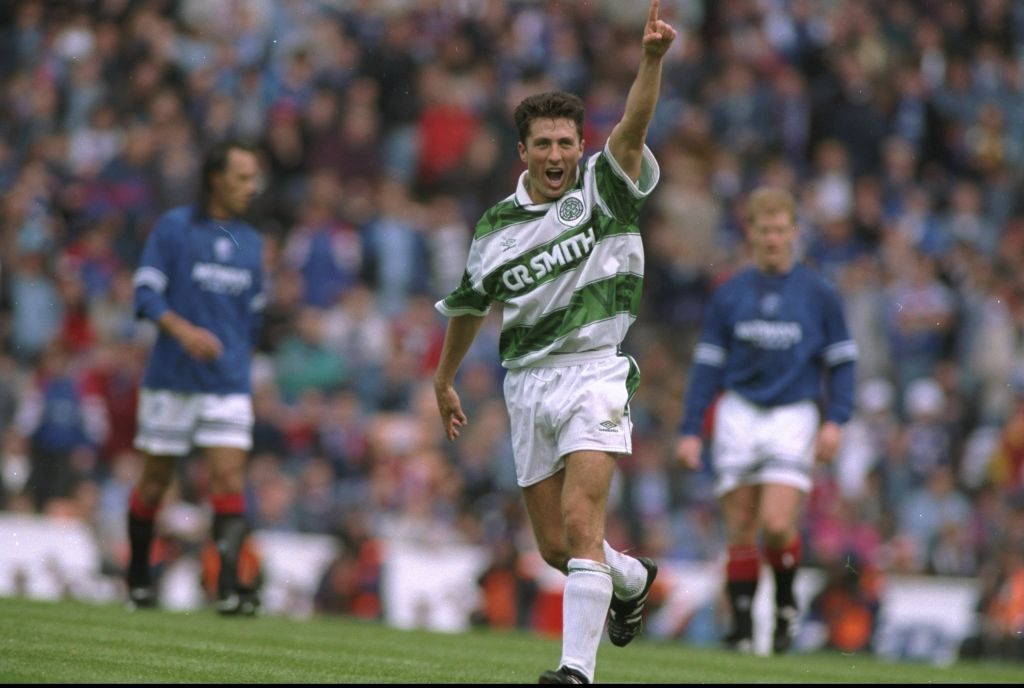 1994: John Collins celebrates a goal during a match against Rangers at Ibrox. Photo Allsport UK