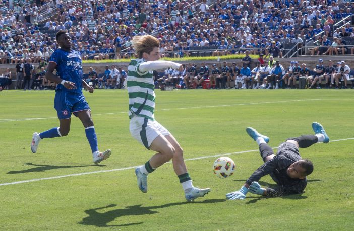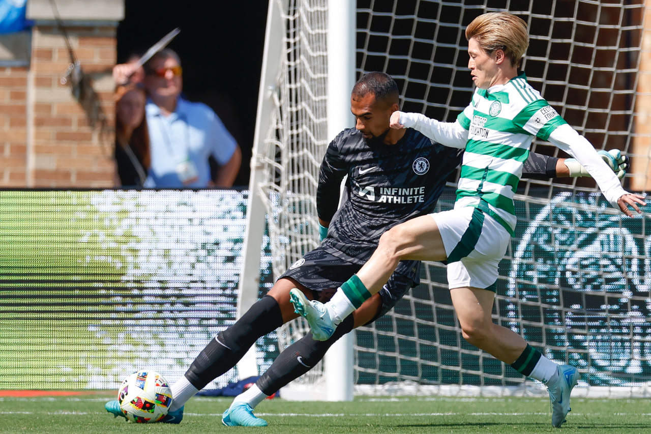 Celtic’s Japanese forward Kyogo Furuhashi pressures Chelsea’s Spanish goalkeeper Robert Sanchez during the match at Notre Dame Stadium in South Bend, Indiana, on July 27, 2024.(Photo by KAMIL KRZACZYNSKI/AFP via Getty Images)