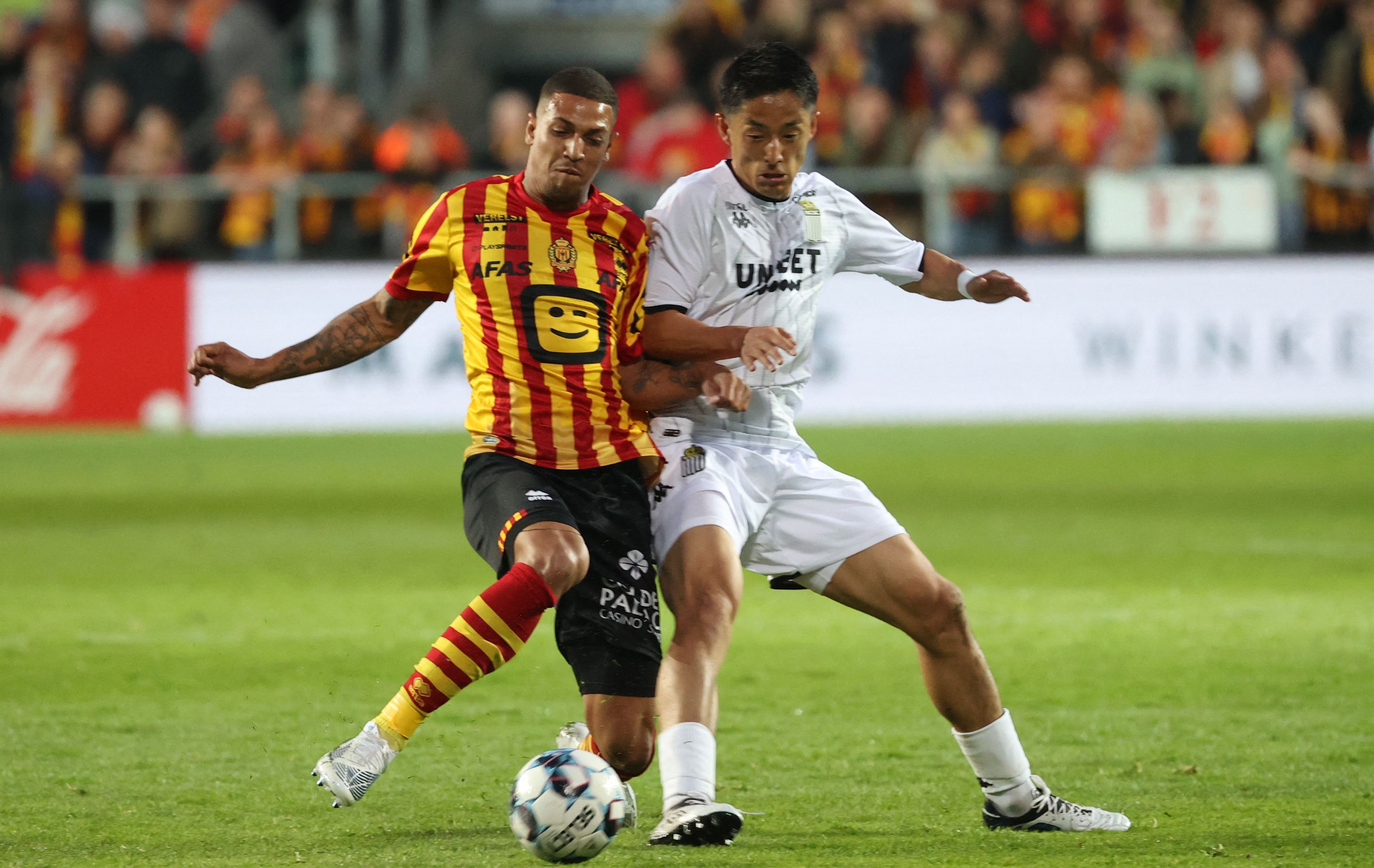 Gent’s Vadis Odjidja-Ofoe and Mechelen’s Vinicius Souza fight for the ball during a soccer match between KV Mechelen and KAA Gent, Tuesday 10 May 2022 in Mechelen, (Photo by KURT DESPLENTER/BELGA MAG/AFP via Getty Images)