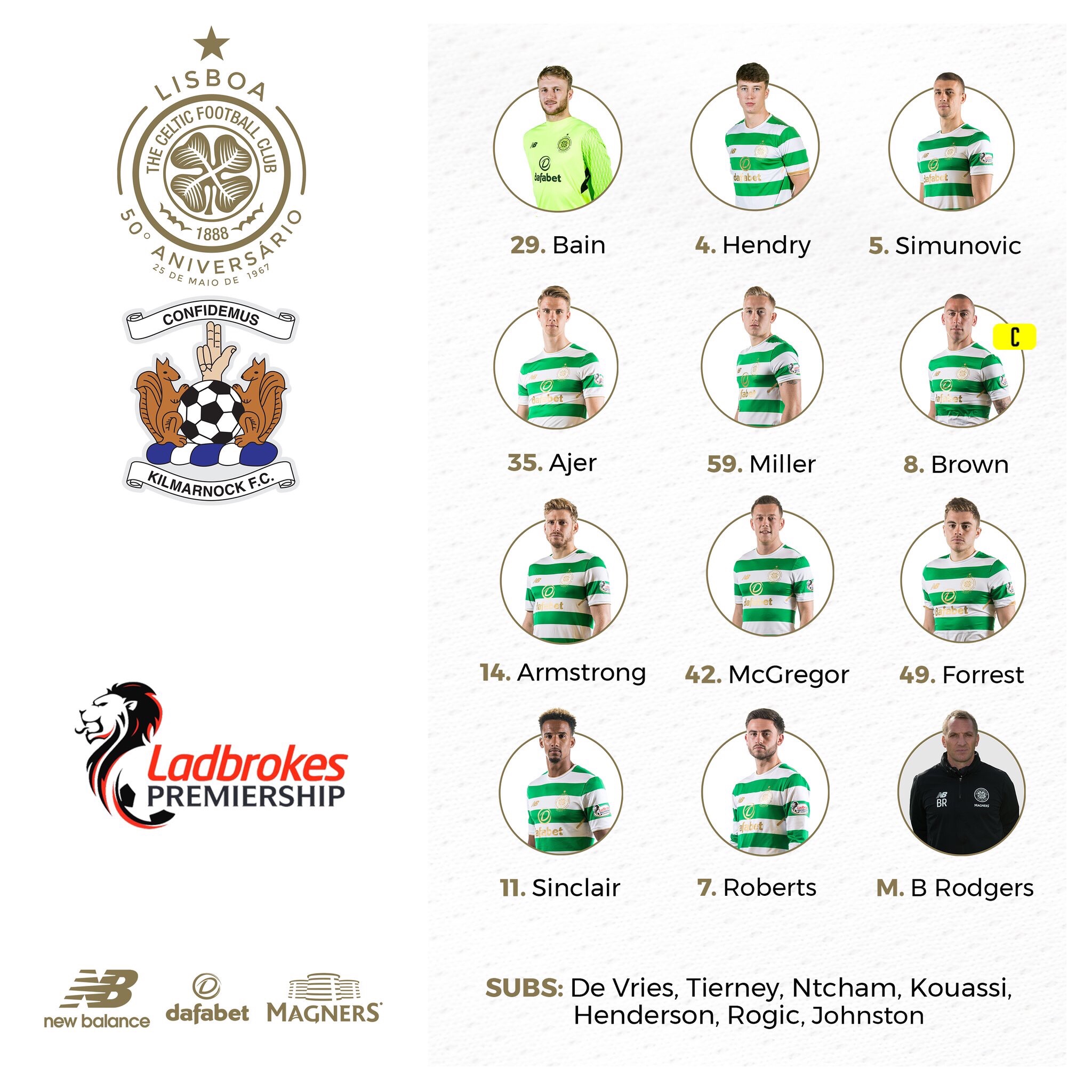 Scott Brown, Callum McGregor, James Forrest and Scotty Sinclair make up the remaining places in the starting eleven.
