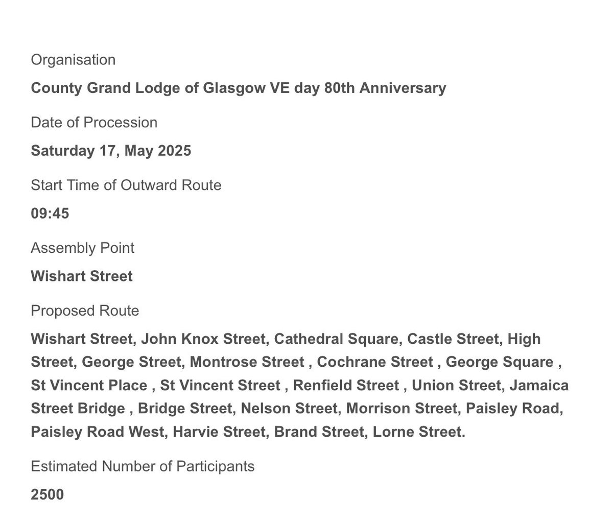 They probably have some of these hate marches too – hatred of Roman Catholics – but nothing like on the scale Glasgow City Council allows. Apparently this one is to celebrate the 80th Anniversary of VE Day, well if it had to go ahead they should be marching past the Govan shipyards because that’s were all the Rangers players were hiding during WW2.