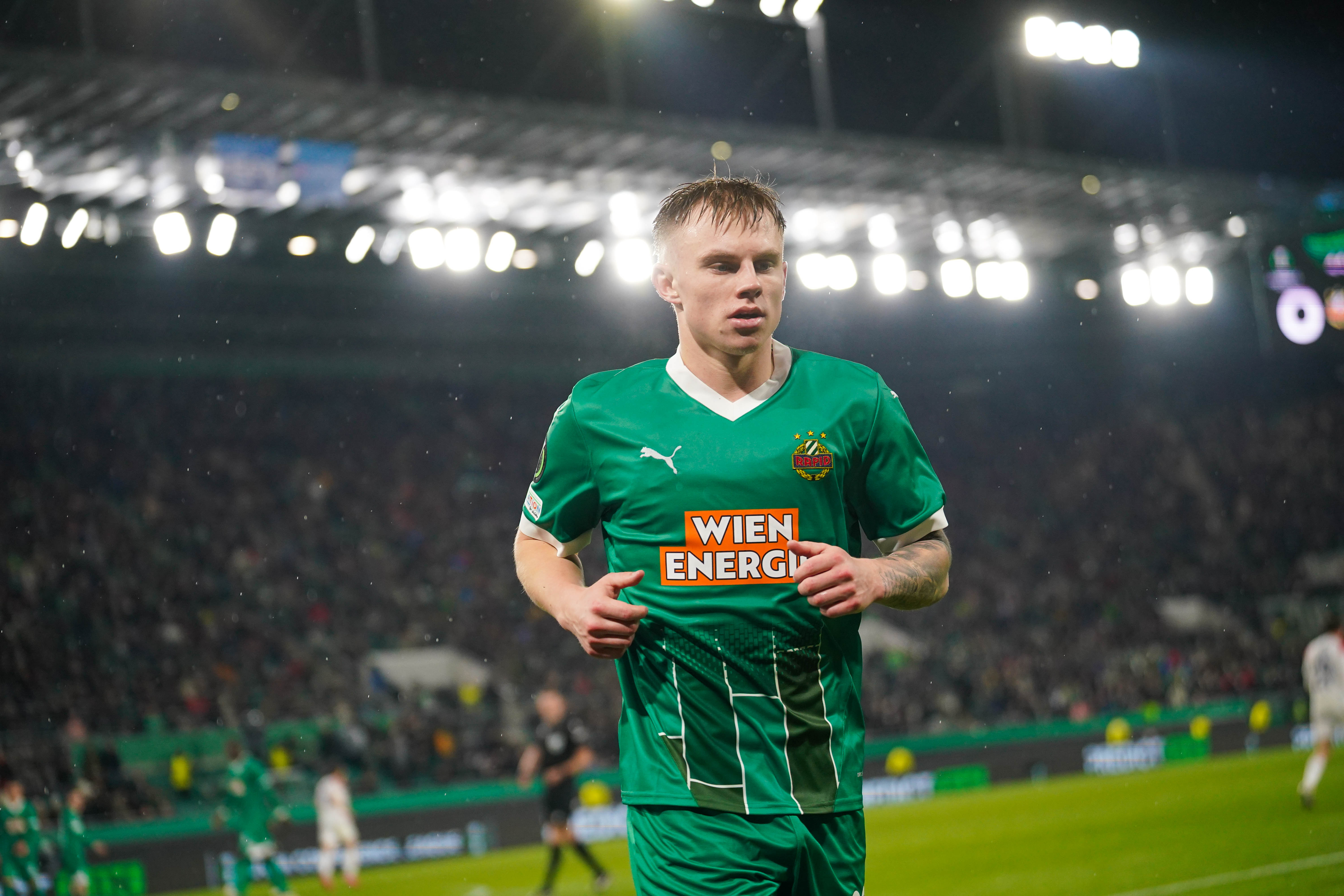 Isak Jansson of SK Rapid Wien is put under pressure by Thomas Delaney of FC Copenhagen during the UEFA Conference League 2024/25 League Phase MD6 match between SK Rapid and F.C. Copenhagen at Allianz Stadion on December 19, 2024 in Vienna, Austria. (Photo by Christian Hofer/Getty Images)