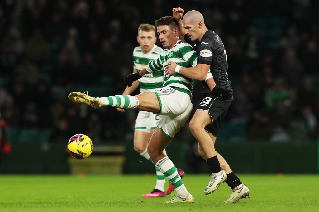 Matt O’Riley of Celtic is challenged by Alex Gogic of St Mirren during the Cinch Scottish Premiership match between Celtic FC and St. Mirren FC at Celtic Park on January 18, 2023 (Photo by Ian MacNicol/Getty Images)