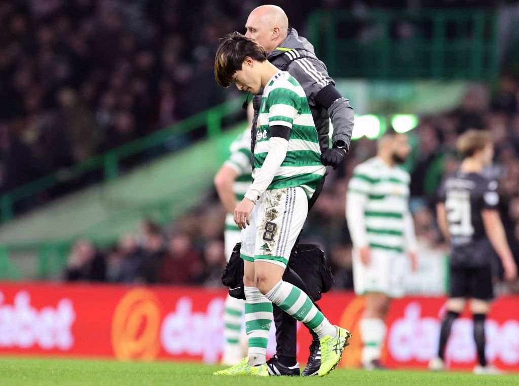 Celtic v St Mirren – Scottish Cup – Fifth Round – Celtic Park Celtics Kyogo Furuhashi leaves the pitch injured during the Scottish Cup fifth round match at Celtic Park, Saturday February 11, 2023. Photo Steve Welsh