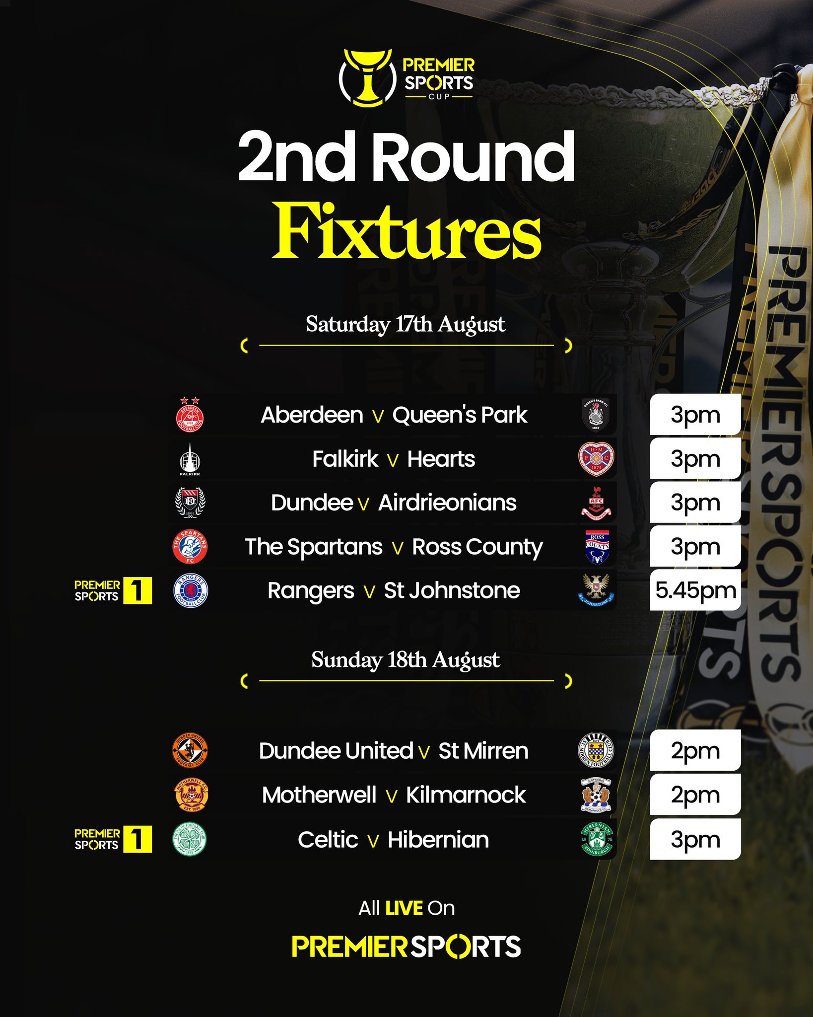 TheRangers v St Johnstone game, which will be played at Hampden as Ibrox is currently unfit for purpose, will take place on Saturday 17 August with a 5.45pm kick-off slot and that tie too will be live on Premier Sports 1.