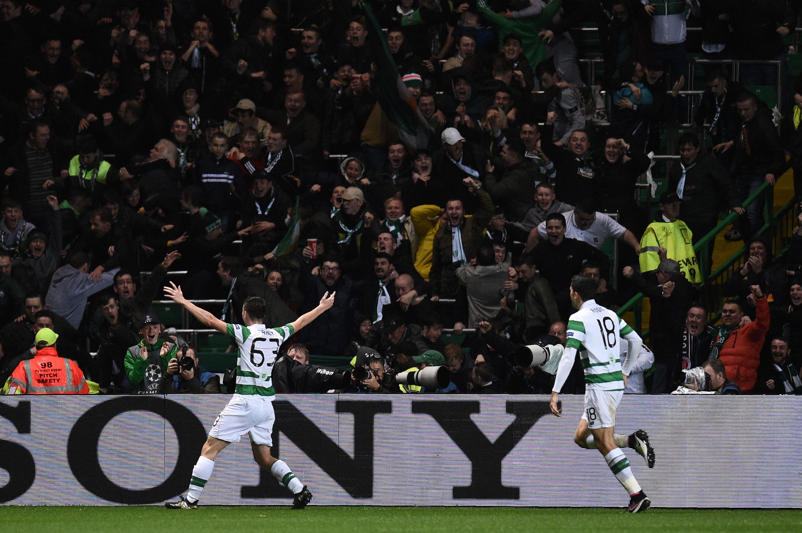 Kieran Tierney celebrates scoring our second goal during the UEFA Champions League match between Celtic and Manchester City at Celtic Park on September 28, 2016.(Photo OLI SCARFF/AFP via Getty Images)